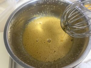 レシピ通りにボウルに卵を割りほぐし砂糖を入れてよく混ぜます。
