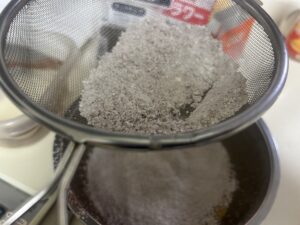 サラダ油を加えて混ぜたら、合わせた粉類(薄力粉・ココア・ベーキングパウダー)をふるい入れて混ぜ合わせます。