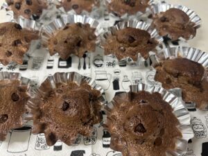 マドレーヌ型が小さい物しかなかったので、分け入れてチョコチップを散らし、グリルで焼きました!