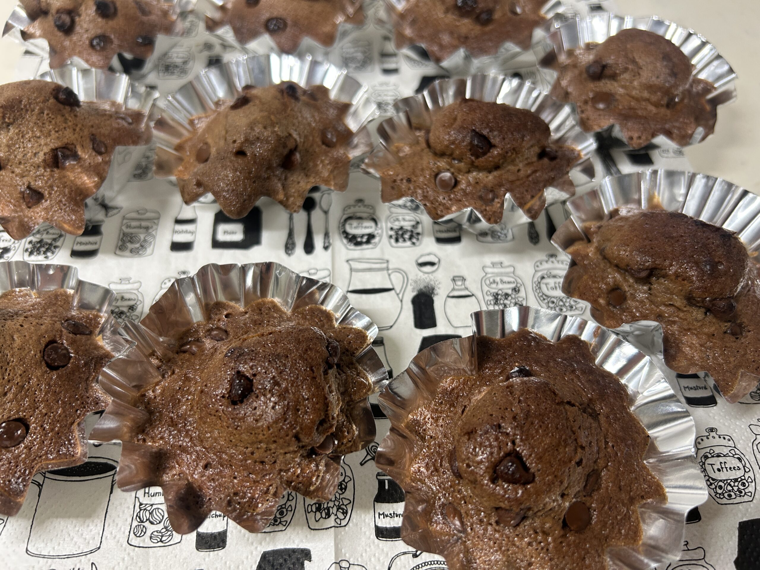 マドレーヌ型が小さい物しかなかったので、分け入れてチョコチップを散らし、グリルで焼きました!